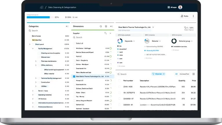 Our data cleansing and data categorization software provides an innovative toolset to categorize spend and consolidate suppliers intelligently and at speed. By applying machine learning and our proven expertise, we automate as many steps as possible. We help you unlock insights within days instead of months by leveraging our automated and intelligent supplier consolidation and spend categorization backed by our supplier knowledge base. A user-friendly front-end helps you create, validate, and browse categorization and consolidation quickly and easily.
