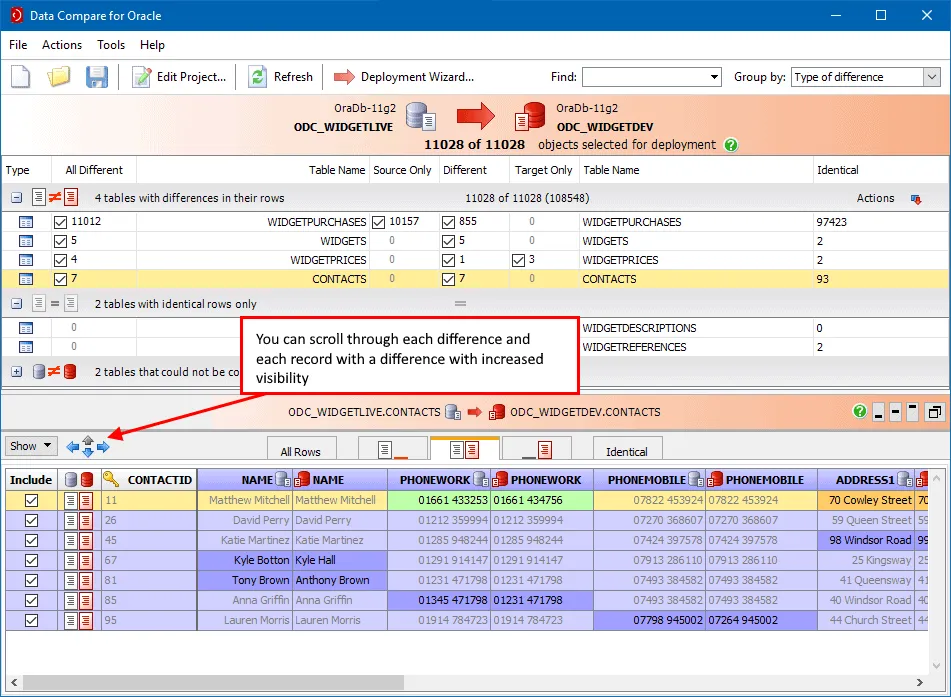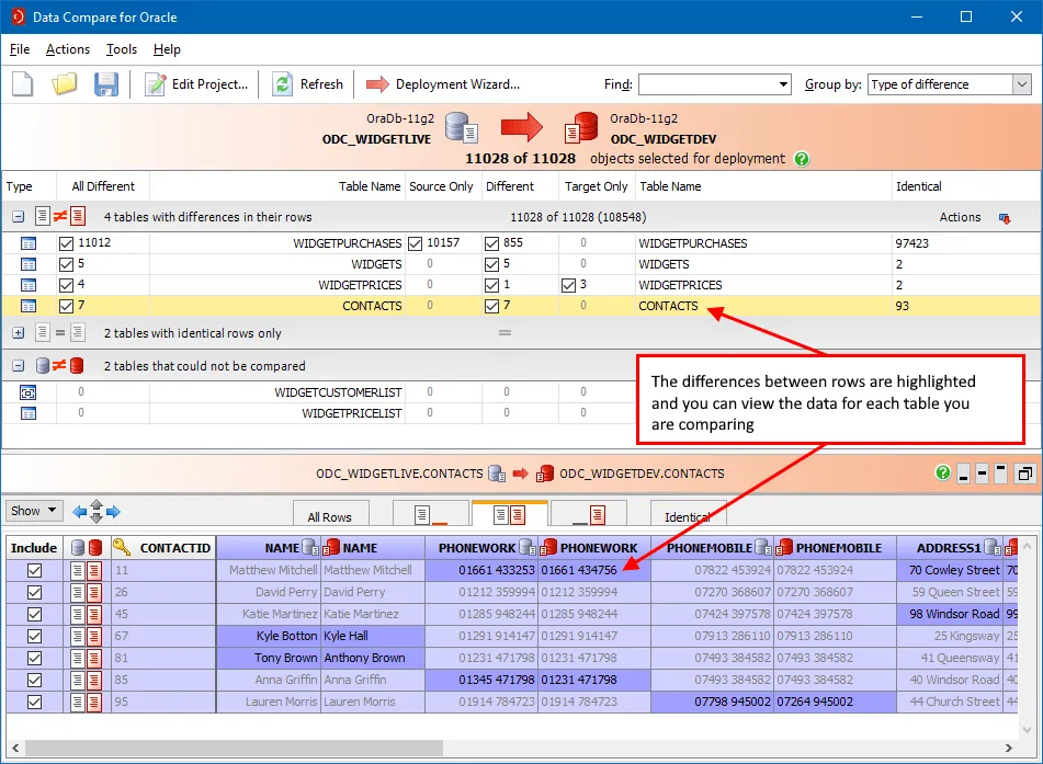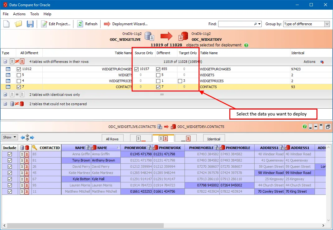 Compare data in tables across schemas and see differences. Drill down through individual records or group them together. Create error-free SQL deployment scripts to deploy data changes between your environments.