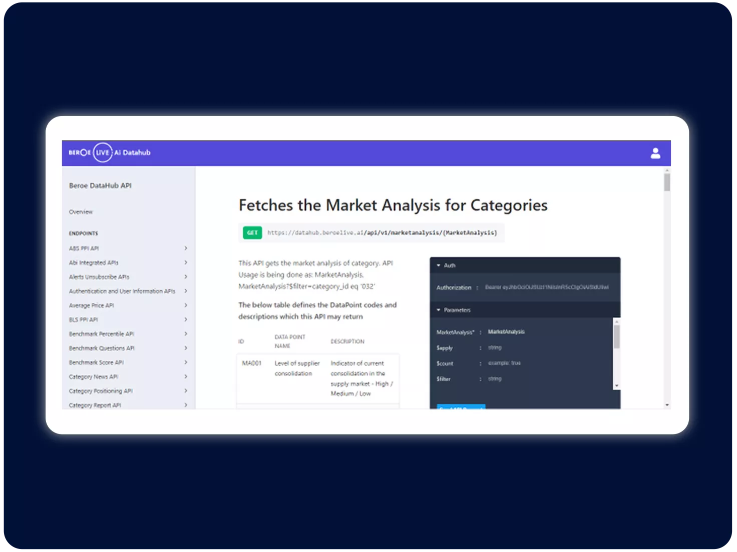 Beroe’s Datahub goes beyond traditional market intelligence by extending Beroe’s own researched and curated data, offering a comprehensive view of the global procurement landscape with trusted insights on thousands of suppliers, categories, and entire supply chains. Our flexible REST APIs seamlessly integrate with your existing procurement ecosystem – from S2P suites to custom solutions and internal dashboards – delivering vital intelligence exactly when and where you need it, reducing time-to-insight for Technology and Solutions providers. Here's how you can leverage DataHub to access the data you need at key decision-making stages: