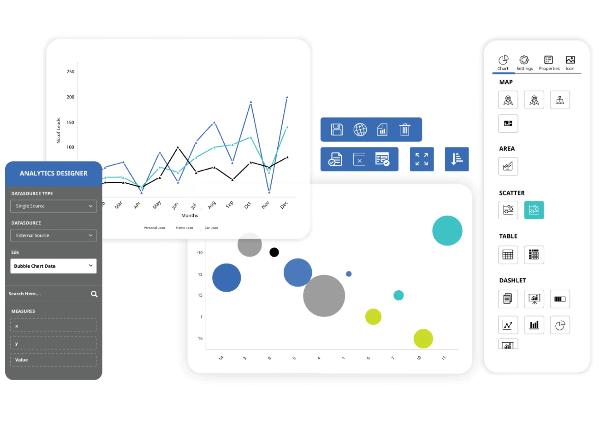 - Dashboard Designer: Allows users to create intuitive and powerful data dashboards with zero coding, using drag-and-drop visual designers with prebuilt dashboard themes. These dashboards can be used for marketing, monitoring, opportunity tracking, and more.