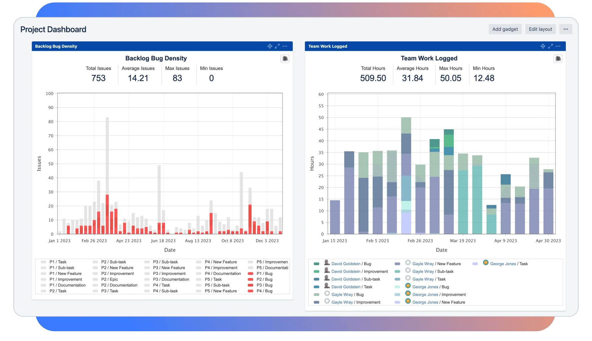 Add your custom charts and metrics to shared Jira dashboards, Confluence pages, subscription emails, and exported PDF, Excel, and CSV files.