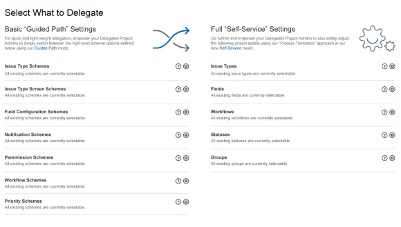 Granular permission settings allow admins to select which users or groups can modify their projects' screens, fields, notifications, permissions, workflows, or issue types, even without full admin rights.