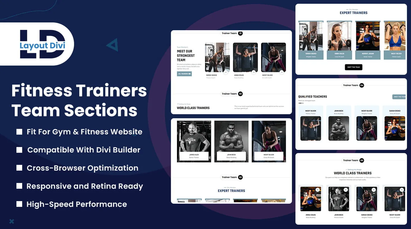 - 10+ Unique Designs: A variety of team section styles for different fitness brands.