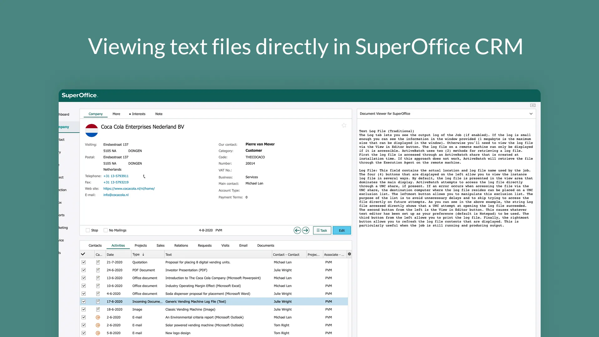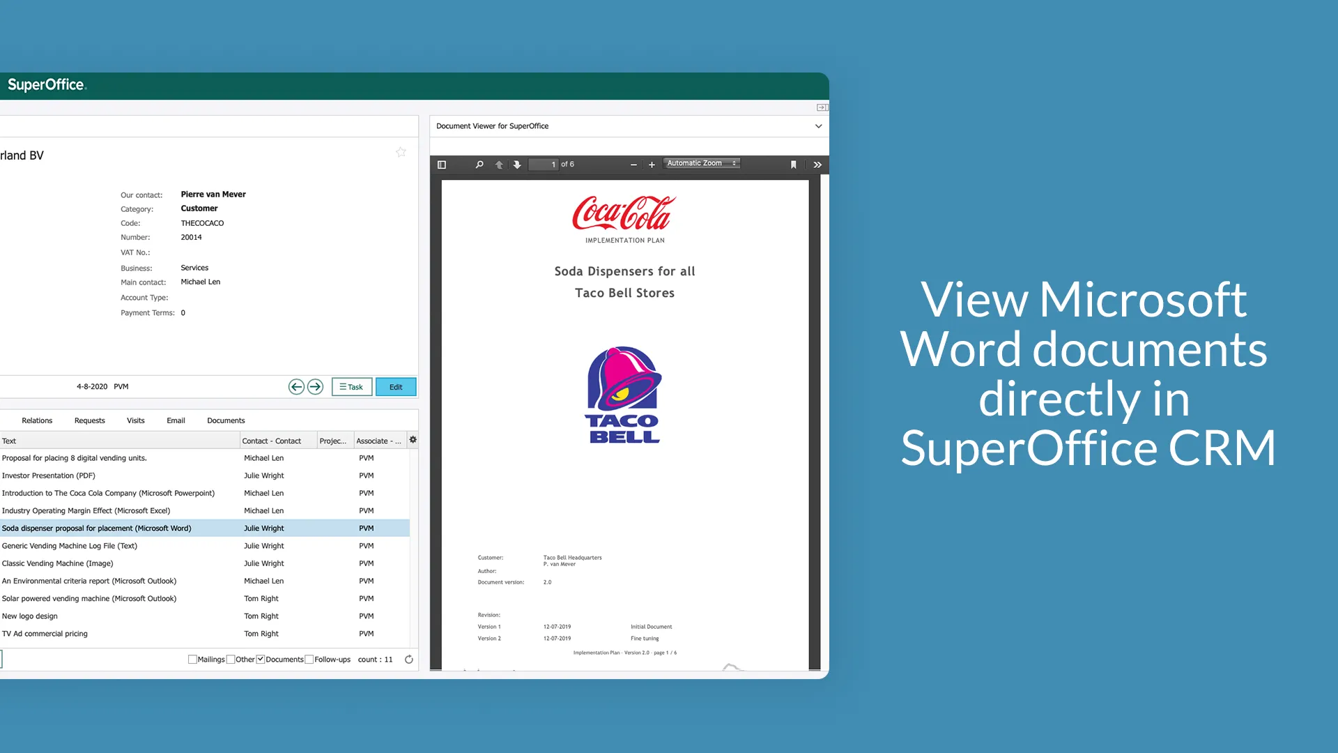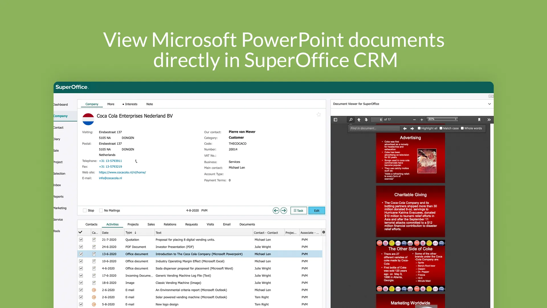Creating and storing new documents and emails is easy in SuperOffice CRM Online. However, finding and recognizing documents among other content can be more cumbersome. With Document viewer for SuperOffice CRM, you can view the content of your documents directly inside SuperOffice CRM with just one click, allowing you to find documents much faster.