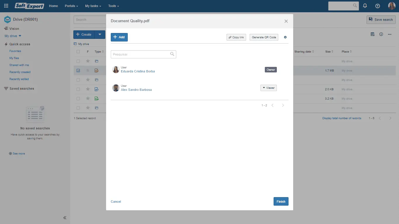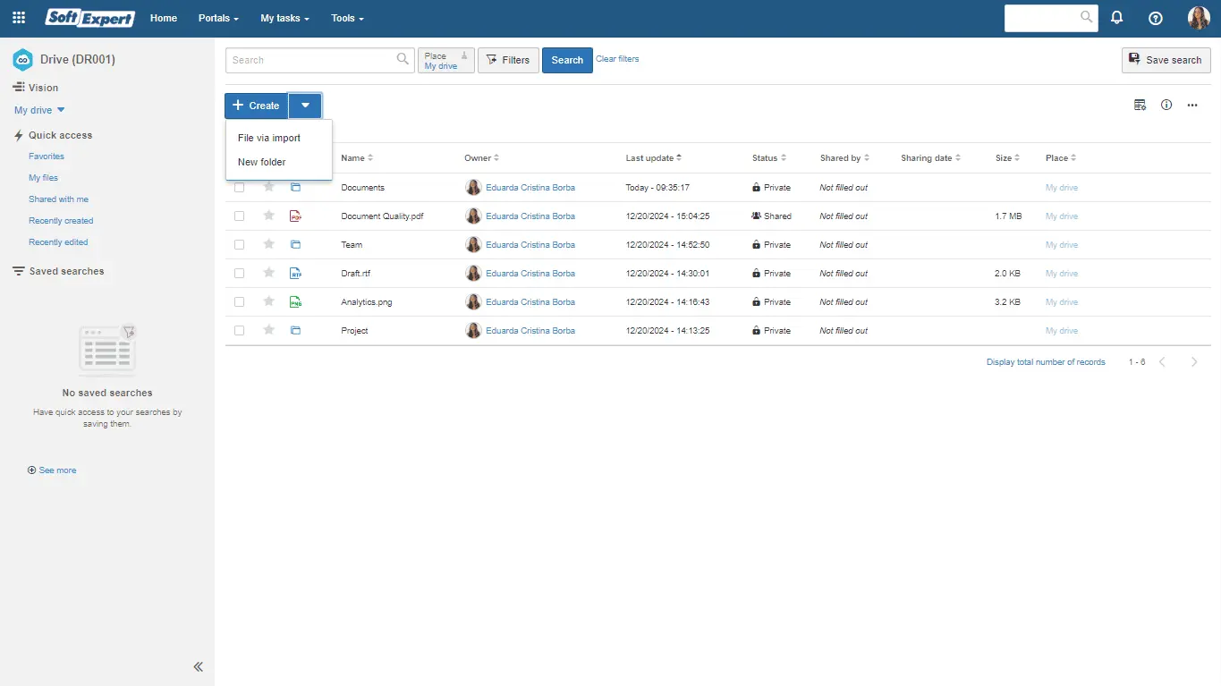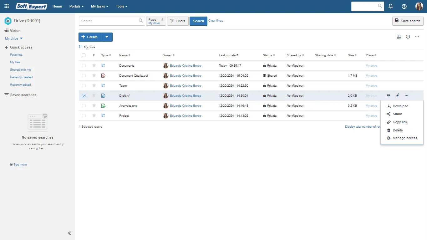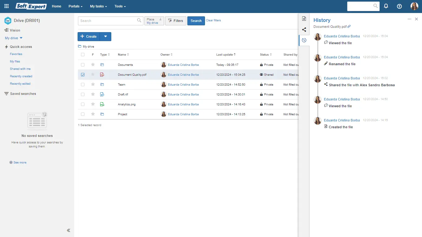 SoftExpert Drive is a tool for securely organizing, storing, and sharing files in the cloud, enhancing collaboration and data integrity.