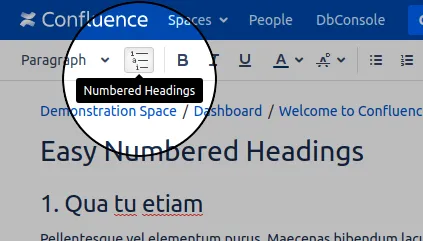 Easily add numbered headings to all headings in a Confluence instance or space. No macros or setup is needed! The numbering can be seen in the editor and in exports to PDF and Word. This add-on works well with the include-page and include-excerpt macros. Included pages automatically inherit numbering from the host page. Numbering can be disabled/enabled for individual heading levels or for individual sections of a page using the Settings macro. *New* Custom formatting is available and can be set globally and in each space. Use numbering formats like "1-A.4(a)" or whatever fullfills your organizations specific needs.