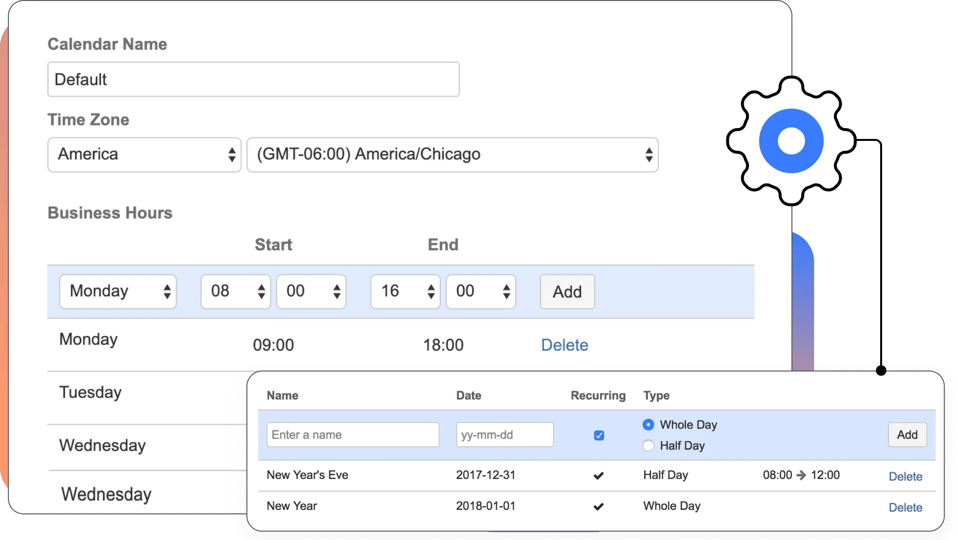Advanced calendar customization for dynamic teams. Add multiple time frames for each day, recurring/one-off holidays, and half days.