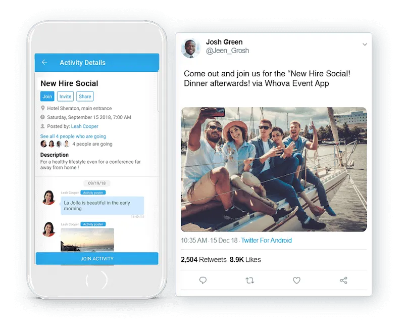 Make Event Advocates out of All Your Attendees Empower your speakers and attendees to share their experience of your event with Whova’s ready-to-post social media templates. Build excitement, boost curiosity, and inspire more people to attend your event by displaying real-time social media posts on your website.