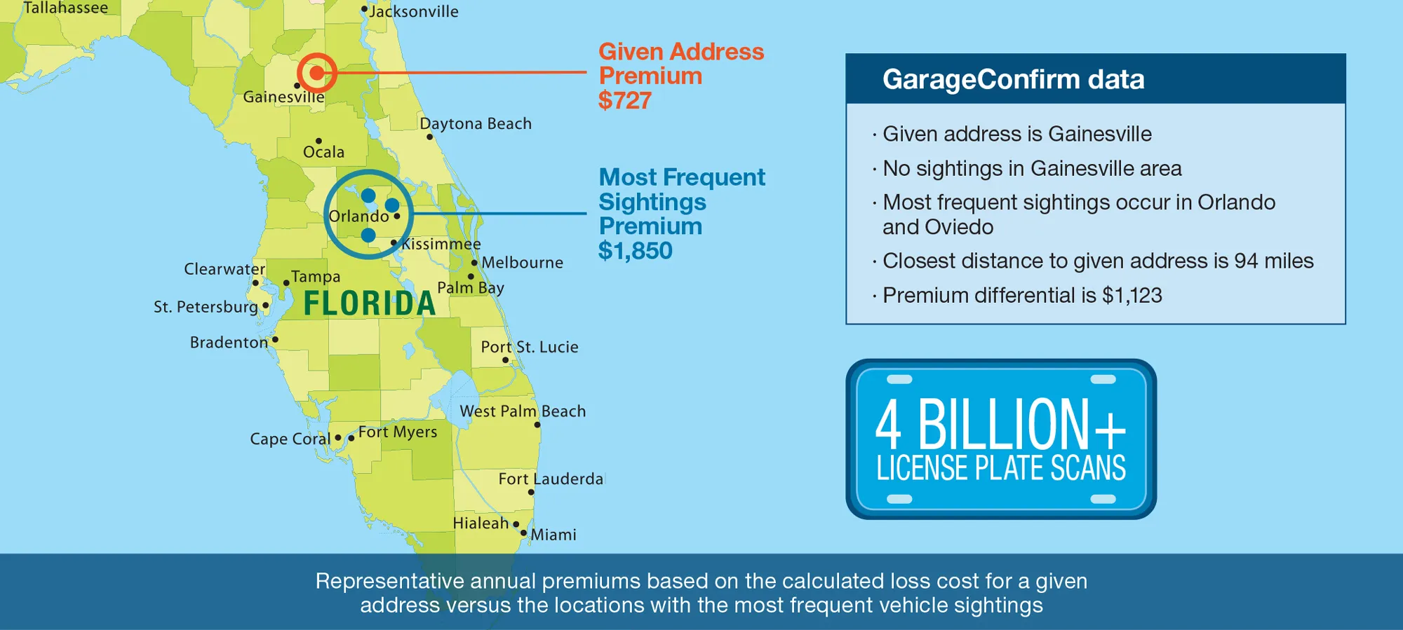 Generate loss costs and premium differential for top-three vehicle sighting locations with access to 4B+ records.