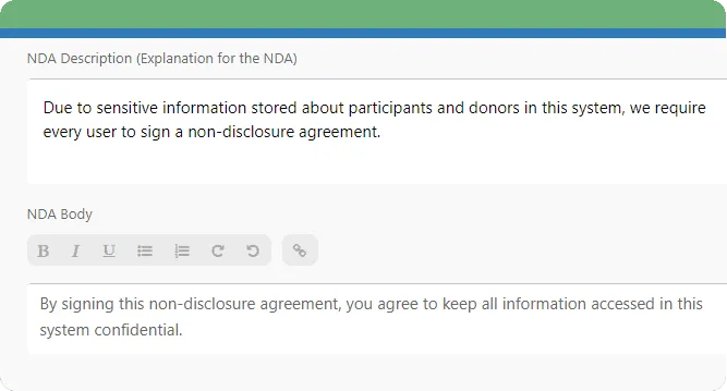 Require Go Method users to sign a non-disclosure agreement to protect information. NDAs are a safeguard against an users from sharing participant, donor, or church information stored in the system.