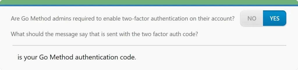 Add a layer of security to admin accounts by requiring additional authentication to log into Go Method.