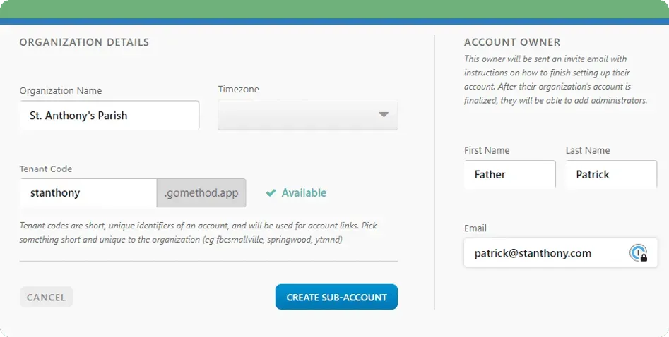 Dioceses and denominational offices can create sub accounts for churches or parishes to manage their own trips, fundraise with their merchant account, and integrate with their ChMS.