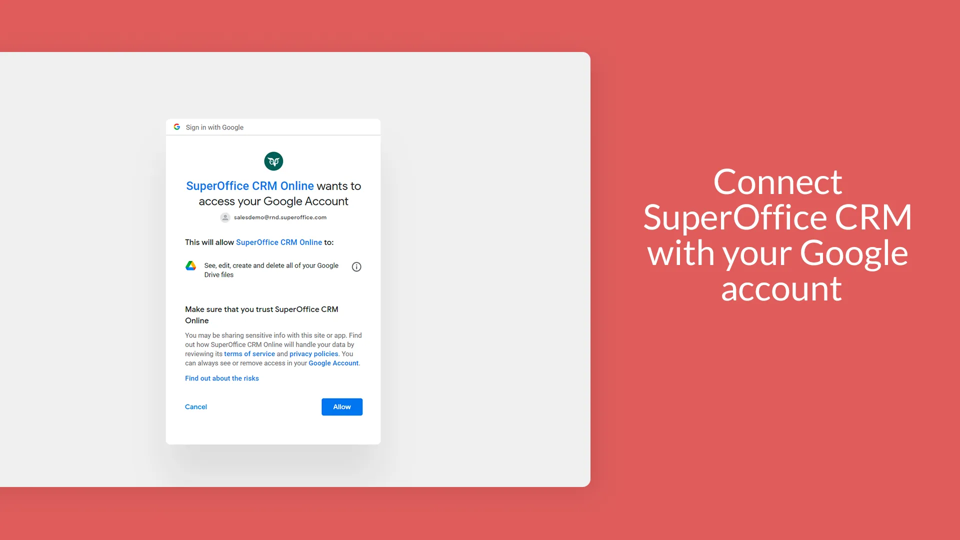 - Benefit from all the document management features available in Google Workspace directly from your SuperOffice CRM.