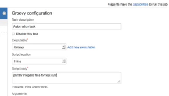 Use the file option to run build scripts or other automation from your repository source. Use inline scripts for quick automation, test set up, test clean up, build result manipulation, or distribution logic.