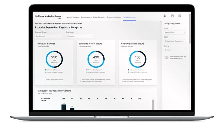 Healthcare is fundamentally local. Leaders across the healthcare value chain need access to clear, consistent intelligence on the market landscape at multiple levels to shape perspectives on opportunities to expand access and scale. However, many leaders must settle for disjointed or incomplete views because they lack the necessary data on demographics, market dynamics, and utilization trends at state, market, and zip code levels to test different hypotheses, uncover valuable insights, and shape actionable strategies. Healthcare Market Intelligence aggregates healthcare-market-level data sets into a unified analytic experience so that organizations can uncover opportunities for improved access to address inefficiencies in the market and accelerate growth. It aggregates proprietary date with third-party healthcare data—compliant with the Health Insurance Portability and Accountability Act (HIPAA)—to visualize and reveal insights related to market demographics, provider and physician landscapes, member enrollment, and service-line-level utilization and pricing.