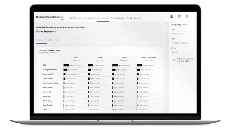 Our analytics engine enables teams to build comprehensive yet actionable insights on the healthcare market through intuitive navigation, curated visualizations, and easy export features. Users can segment data at the micromarket level by using custom combinations of counties, states, and core-based statistical areas.