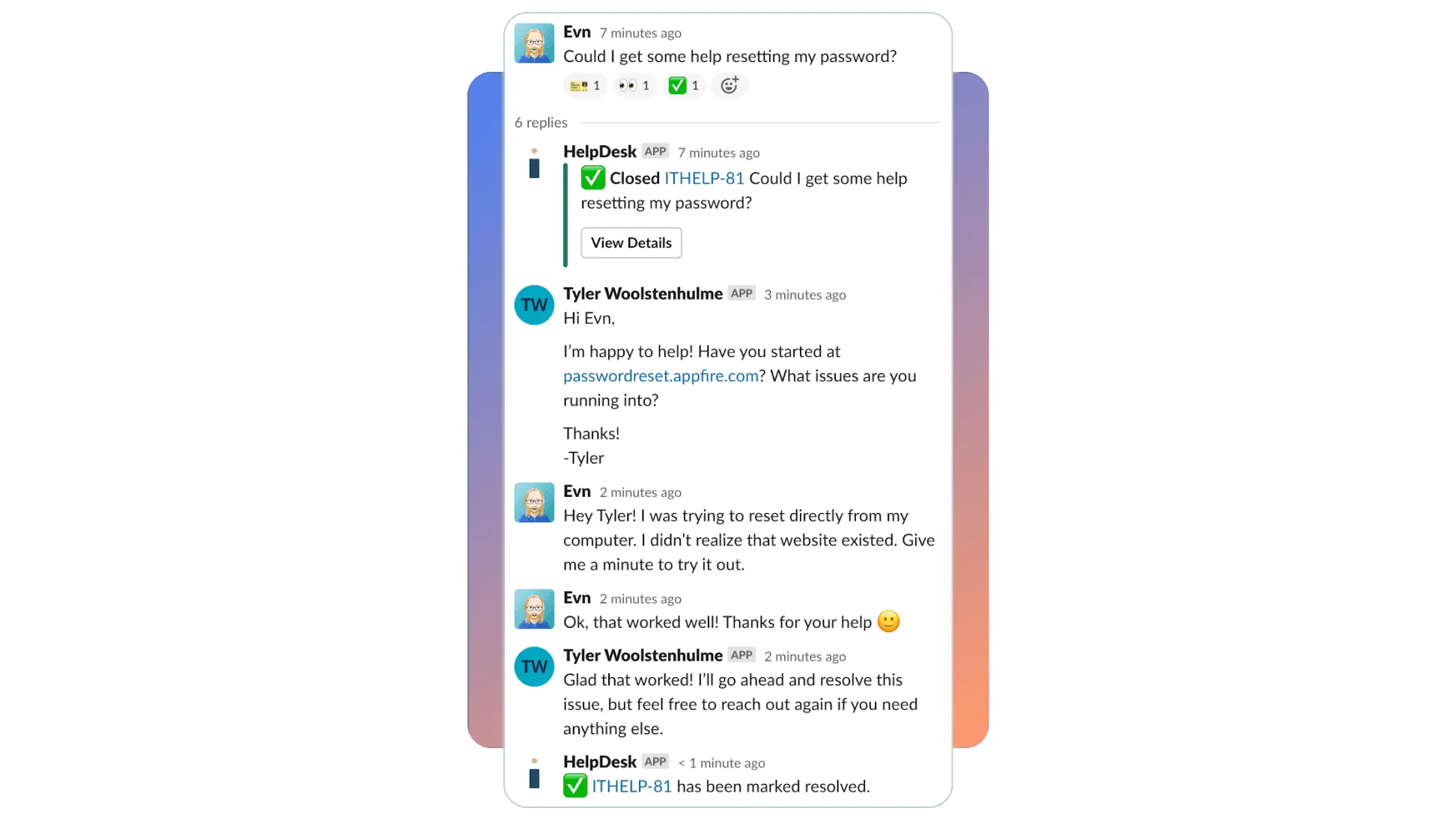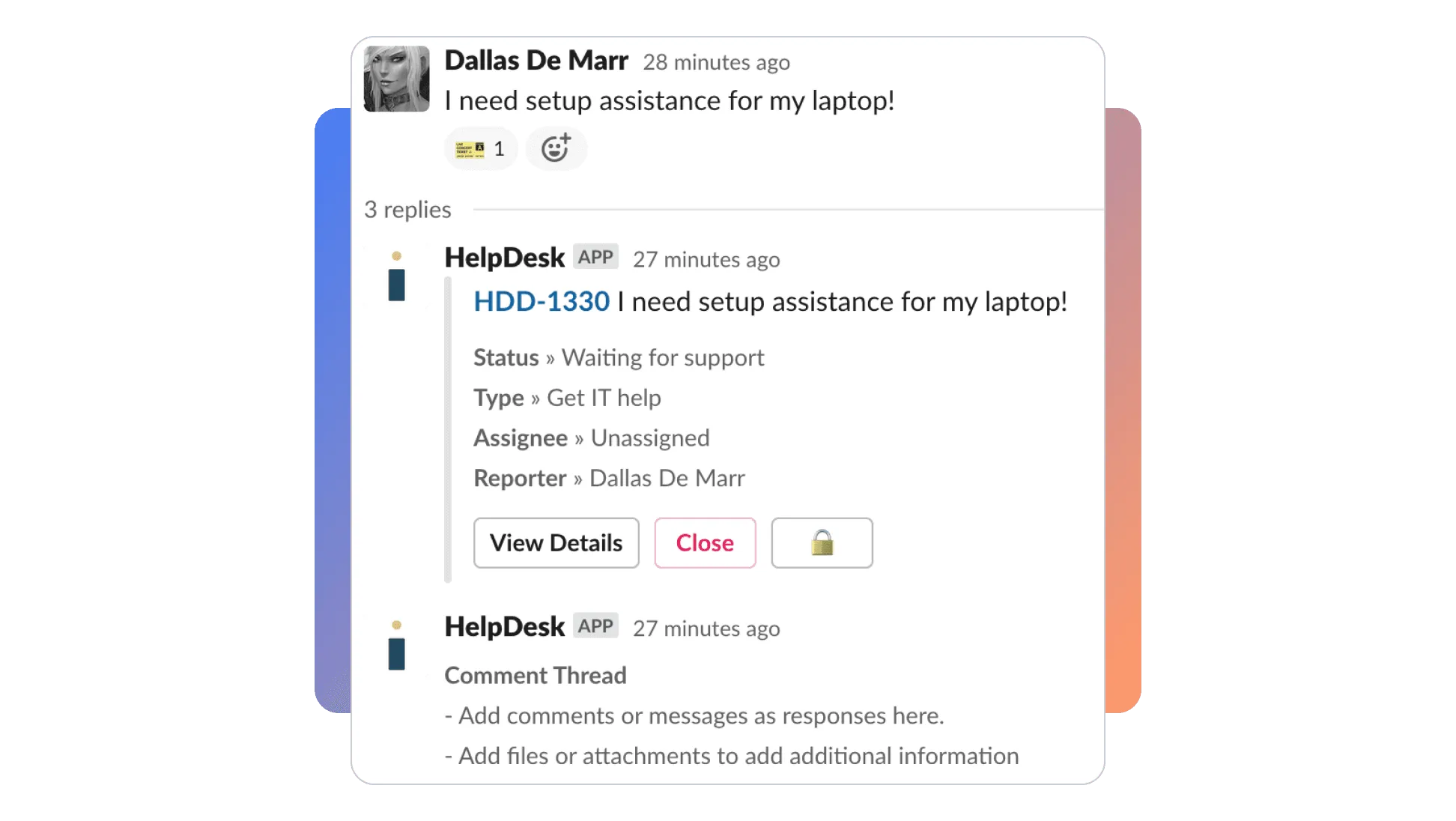 Conversations/updates are synced in real-time as HelpDesk+ mirrors the service desk in Slack and MS Teams.