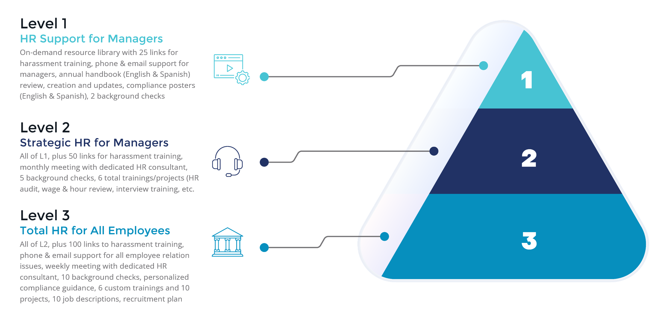 HR laws have changed dramatically in recent years with a barrage of new and ever-evolving federal, state and local legislations that impact businesses of all sizes. It’s imperative to have well-defined policies and procedures to protect your business and your employees. Now, you can tap into HR expertise that’s both comprehensive and affordable. Choose from three HR subscription service levels to meet your needs and budget and get access to affordable resources that empower you to: Maintain Compliance With ever-changing regulations, managing HR is increasingly complex. And the consequences for noncompliance can be significant. Avoid Suprises When it comes to HR, you don’t know what you don’t know. Many HR Services customers are surprised to learn about regulations or policy requirements that impact their business. Recruit & Retain Maintaining up-to-date HR policies and documentation can protect your organization, but it can also enable you to communicate effectively with prospective and current employees.