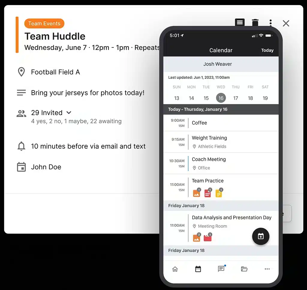 - **Scheduling: **Ensure your team knows exactly where they need to be with unlimited calendars to capture all events, from games to practices to community service and everything in between.