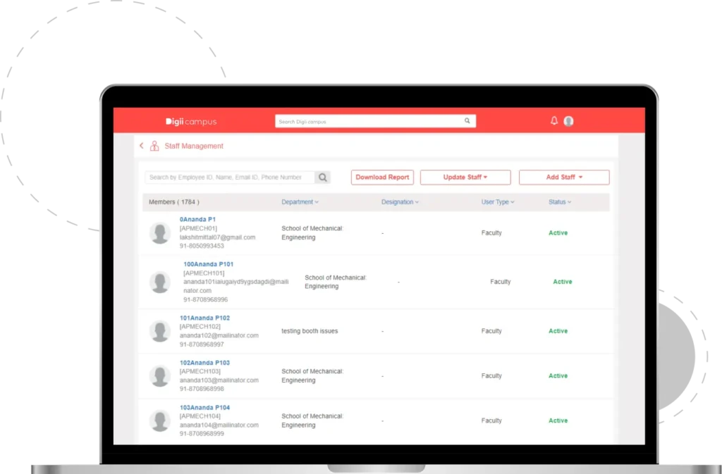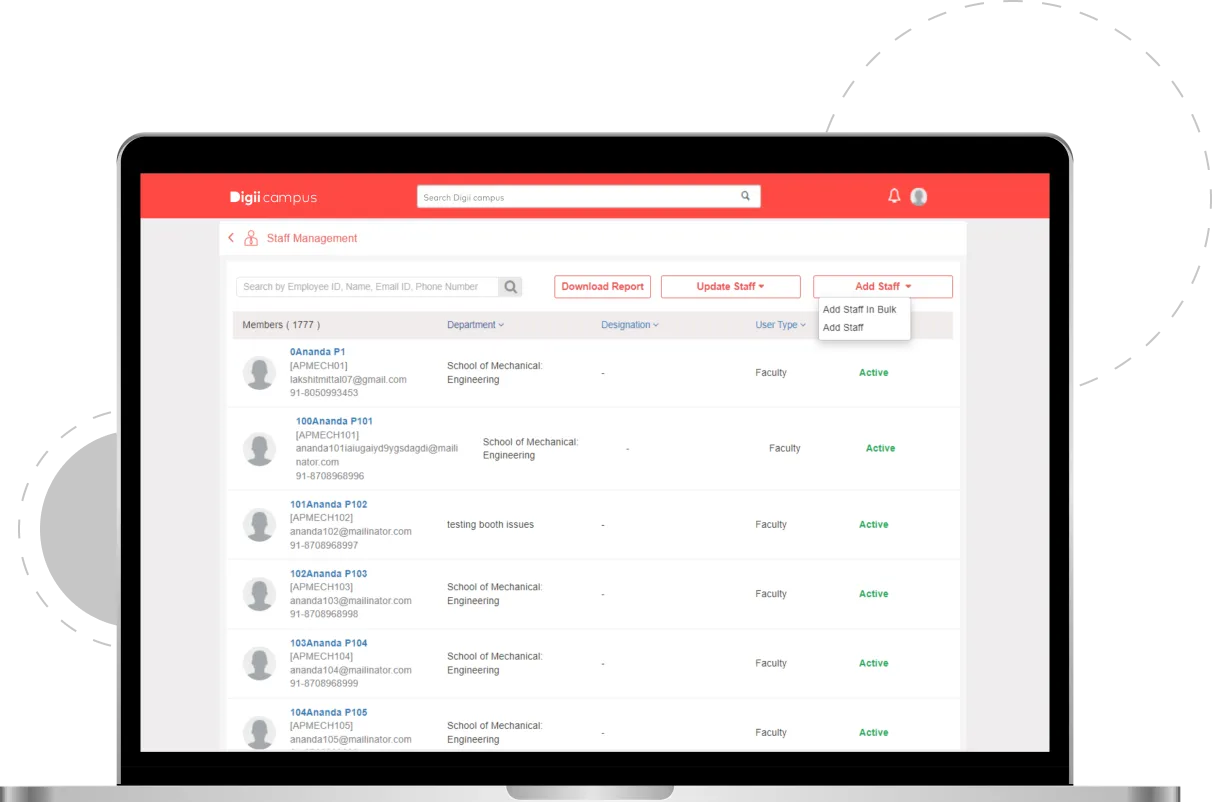 The Human Resource Management system by Digiicampus is designed to streamline campus operations by automating key HR functions. It facilitates effective employee record management, attendance monitoring, and leave tracking. The system supports the setup of master records, attendance system configuration, and integration with Biometric or RFID devices for accurate timekeeping. It also enables the creation and management of detailed employee profiles. This digital staff management system aims to ensure a smooth employee lifecycle within educational institutions, transforming higher education through innovative digital solutions that enhance learning experiences and operational efficiency.