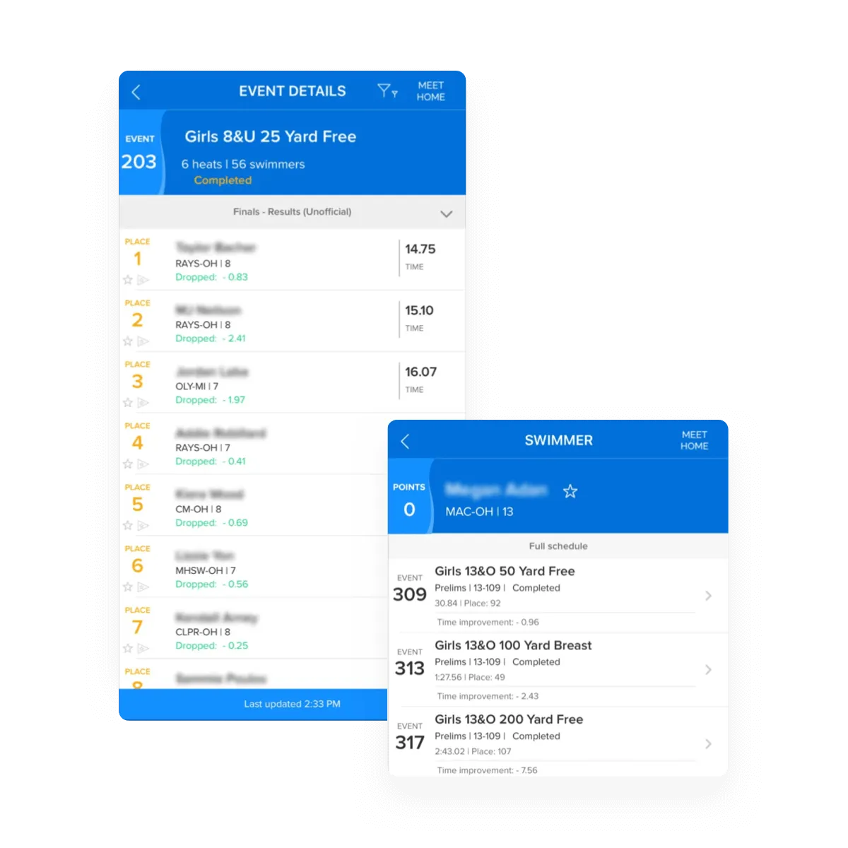 - Sync with Meet Mobile to push out live results to parents, swimmers and fans.