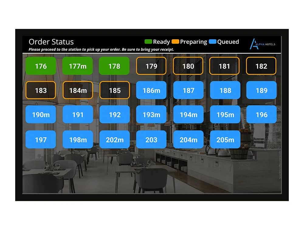 Guest-facing Order Status Display shows status by order number automating the guest notification process. It's simple for customers and time-saving for staff. When the Chef bumps the order, it shows as ready and the guest picks up their food.