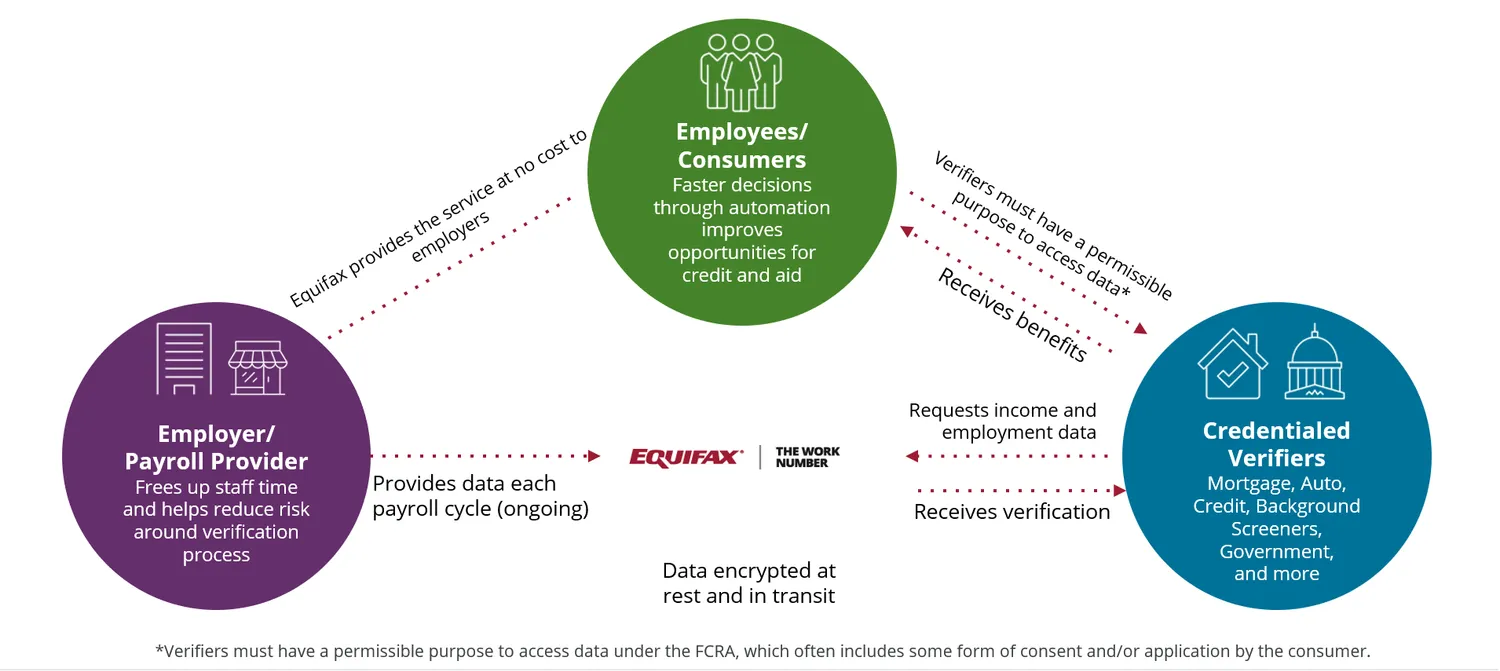 Equifax provides automated income and employment verifications through its integration with Asure providing a more private transfer of information to verifiers on your behalf. The service is governed by the Fair Credit Reporting Act (FCRA) and only accessed by credentialed verifiers with auditable, permissible purpose.