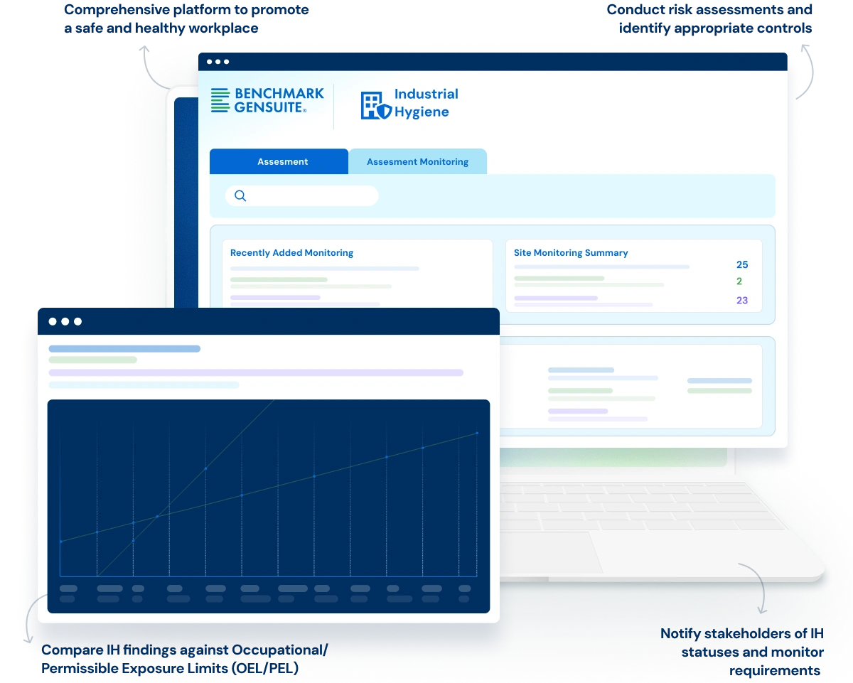 Benchmark Gensuite’s Industrial Hygiene application is a cloud-delivered module within the Benchmark Gensuite EHS platform designed to standardize and centralize industrial hygiene (IH) programs. It consolidates qualitative assessments and quantitative monitoring data, compares results against occupational exposure limits, prioritizes follow-up actions, and delivers analytics and reporting to guide risk mitigation and compliance activities across distributed sites. The solution integrates with mobile workflows and platform-wide capabilities to connect frontline observations with program governance and executive dashboards.