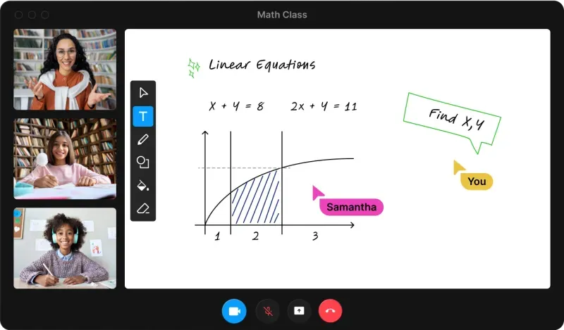 - Complete set of tools: Create a comprehensive online classroom experience with a robust set of online whiteboard collaboration tools such as drawing tools, erasers, undo/redo, text formatting, laser pointer, keyboard shortcuts, view control, and more.