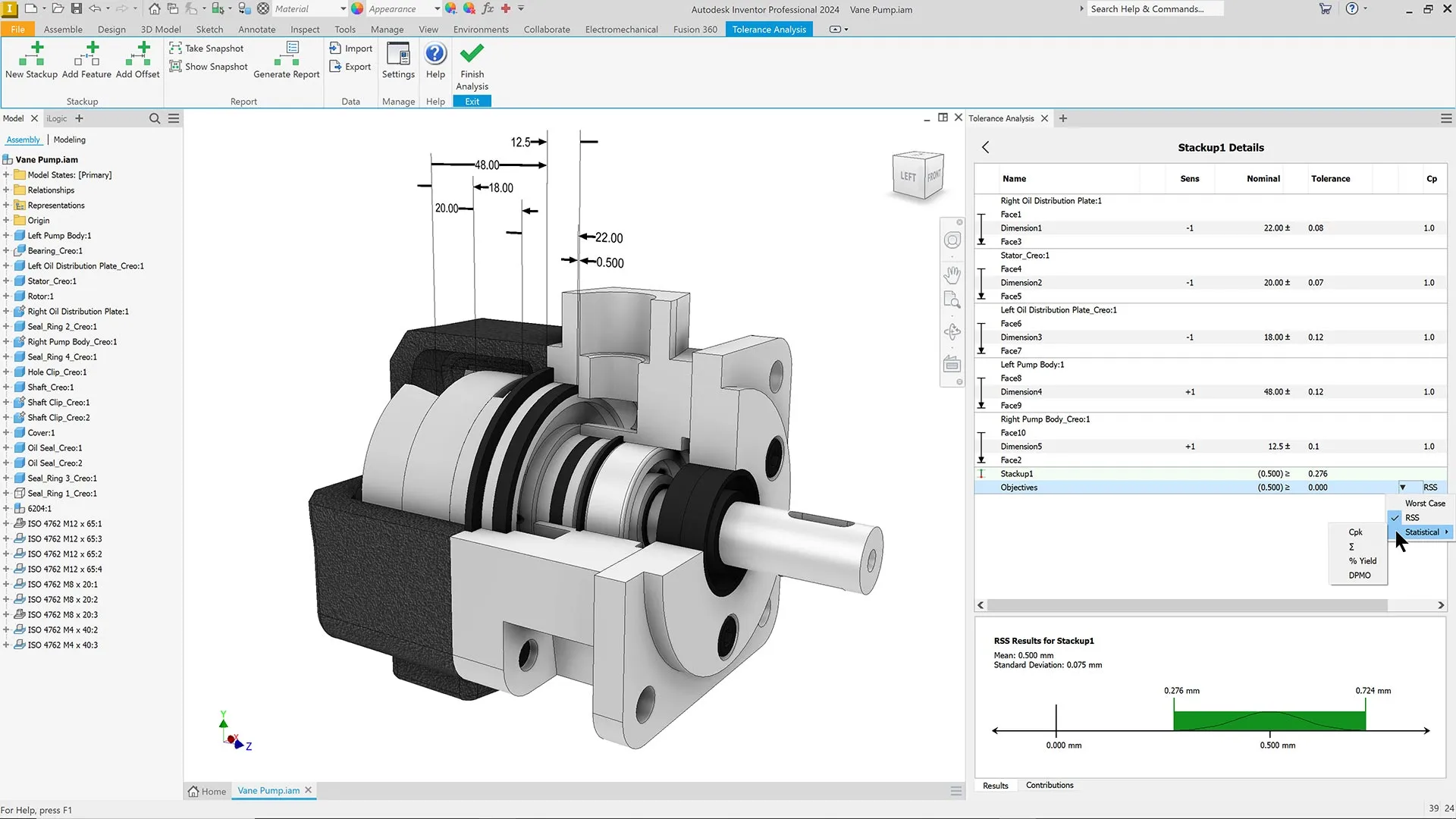 Calculate the worst-case, RSS, and statistical results of the analysis. Report metrics for statistical results such as Cpk, Σ (Sigma), DPMO, or % Yield.