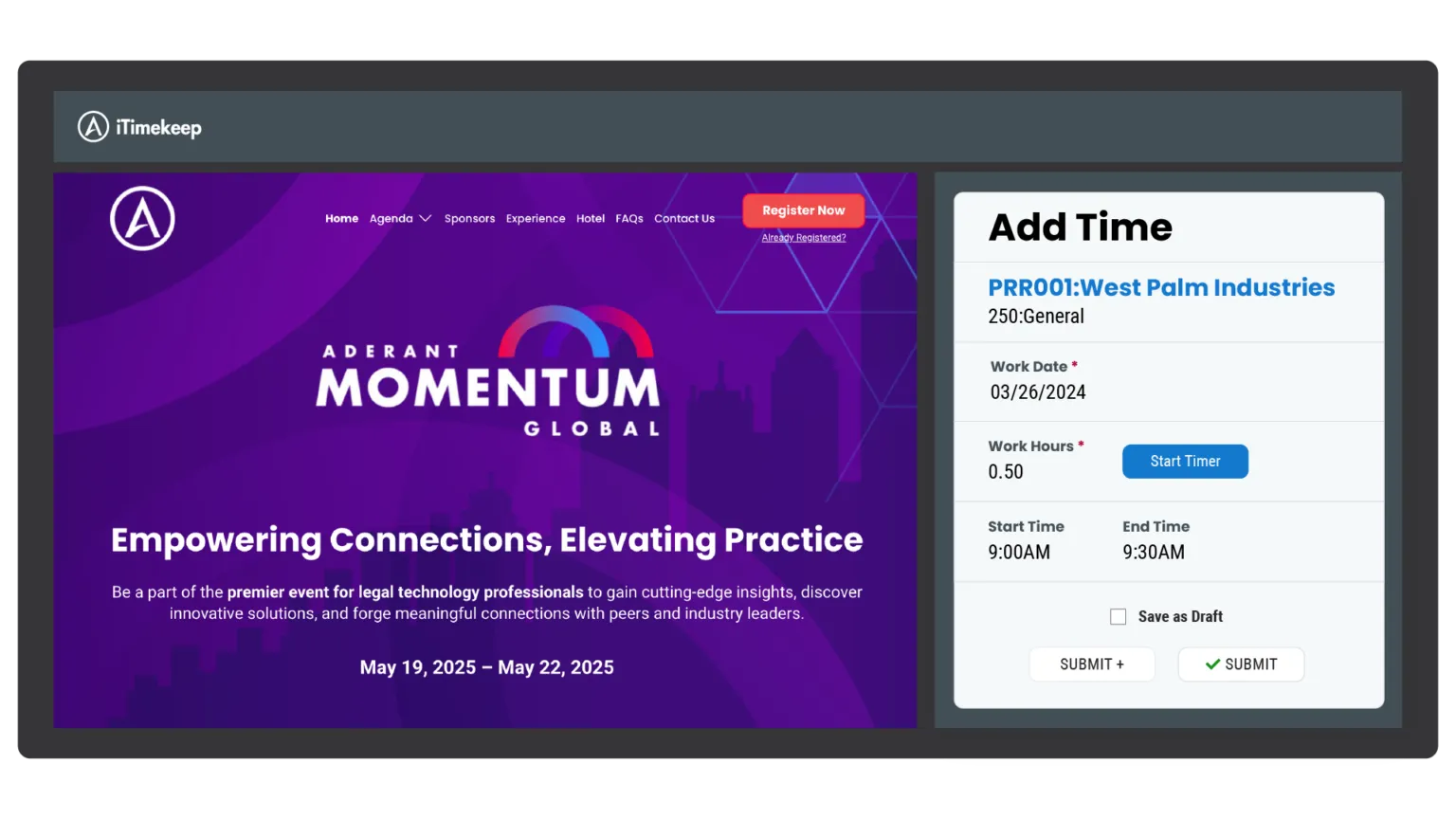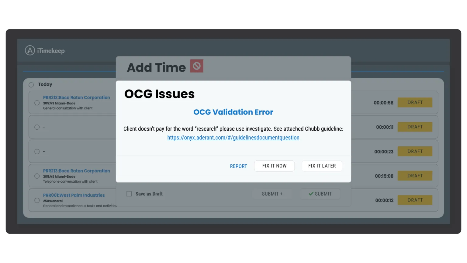- Instant Violation Prevention: Integrated with Aderant Onyx, iTimekeep checks time entries for compliance with client and firm rules at the point of entry.