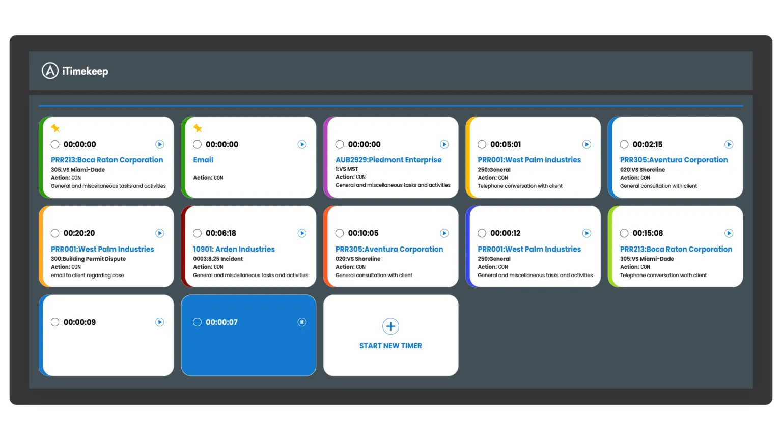 - Smart Timecard: Automatically displays relevant fields based on the matter you select. Start, pause, or stop timers with a single touch.