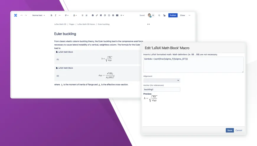 With LaTex Math you can intuitively add mathematical equations, expressions, units, and representations of complex formulas to your Confluence pages, and they will be rendered correctly. LaTex Math macro editor will preview both inline and block equations, making page editing easier. LaTeX Math includes 5 macros that allow users to: