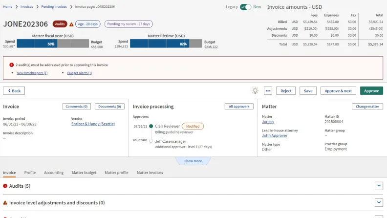 - **Automate your invoicing system with e-billing: **Boost efficiency and save time and money with automated invoice review, legal billing guideline enforcement, and rate management while streamlining communication with outside counsel.