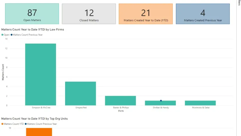 - **Quickly generate financial reports and dashboards on legal spending: **Review, measure, and predict spend and demonstrate your legal department's value to the overall business with robust reporting, powerful AI analytics, and unrivaled benchmarking tools.