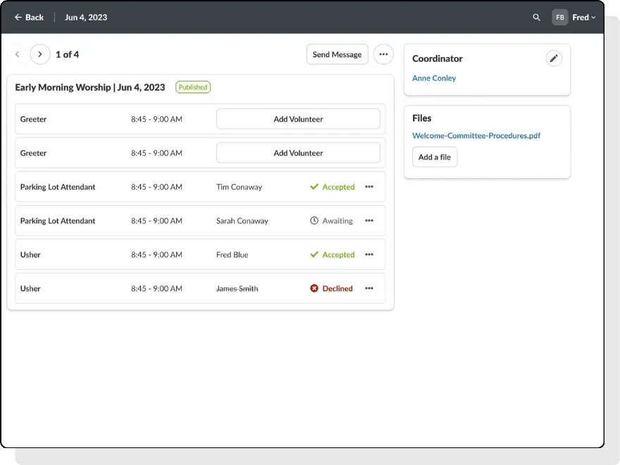 Empower your volunteer coordinators to manage their volunteer teams and roles better. Your team leaders can feel confident volunteers are in place and ready by seeing who accepts or declines serving assignments ahead of time, managing compliance requirements for specific roles, viewing and marking attendance, and communicating directly with volunteers as needed. Plus, your volunteers can see upcoming assignments to serve and sign up for any open opportunities they are willing to fill.