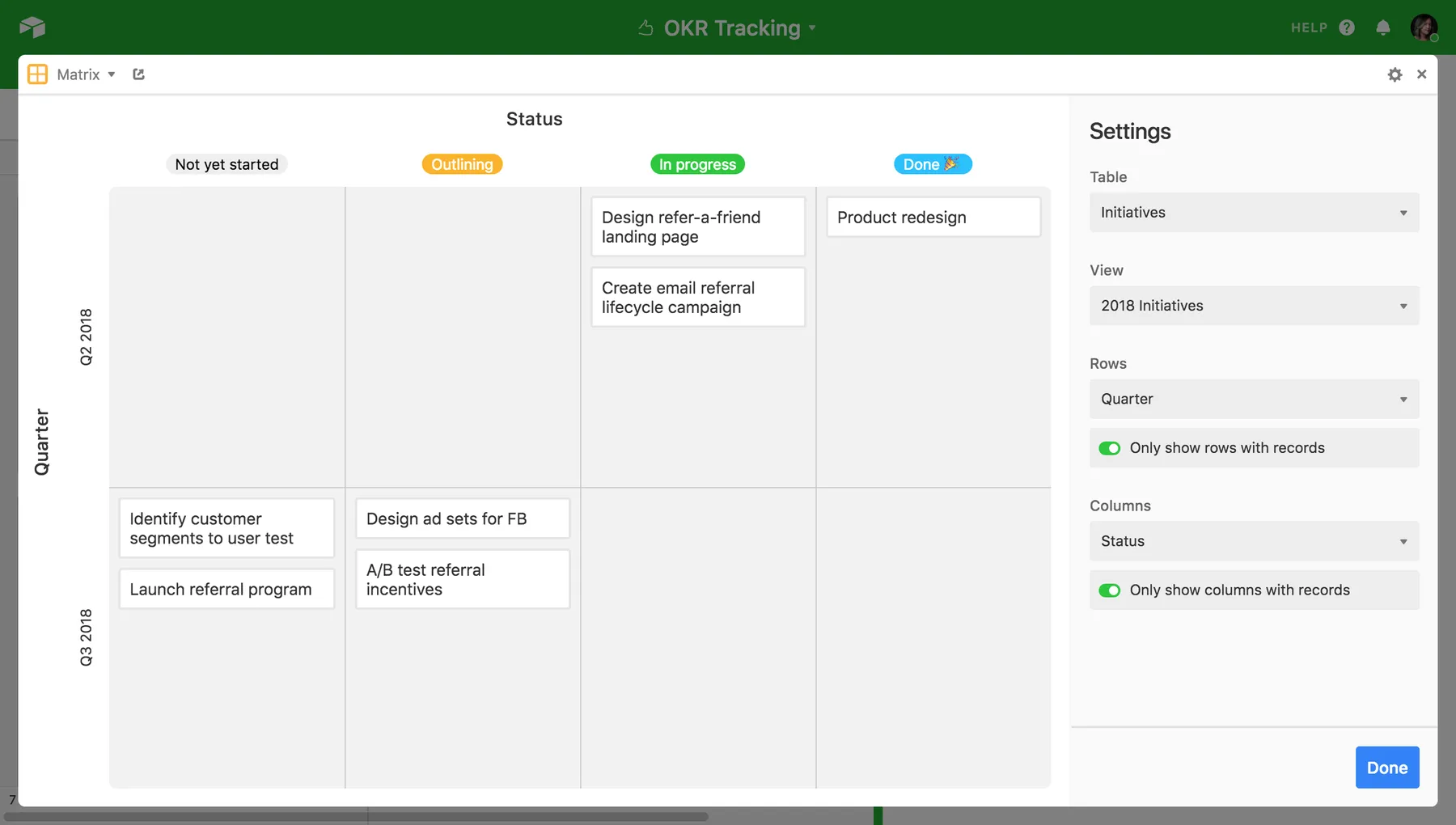 The Matrix app for Airtable allows users to plot records as cards on a rectangular grid, providing a streamlined way to plan and prioritize tasks, objectives, and initiatives in two dimensions.