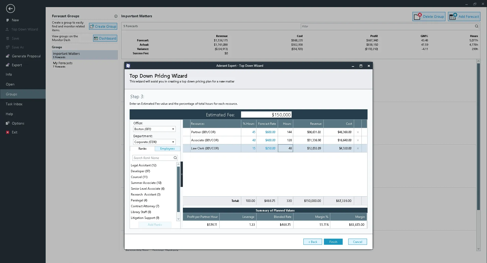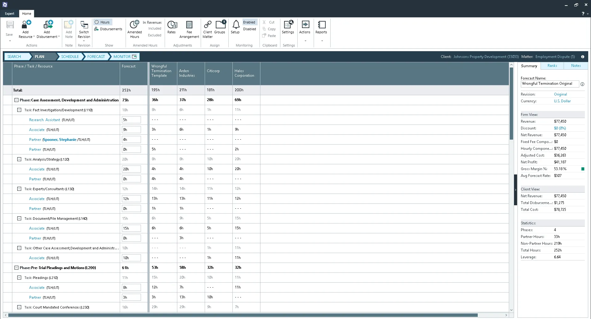 Matter Monitoring that Empowers Action Use selected search results or pre-defined templates to construct matter plans based on actual data from previous engagements. Forecast profitability using historical data to calculate key metrics including revenue, cost, gross profit, and gross margin %.