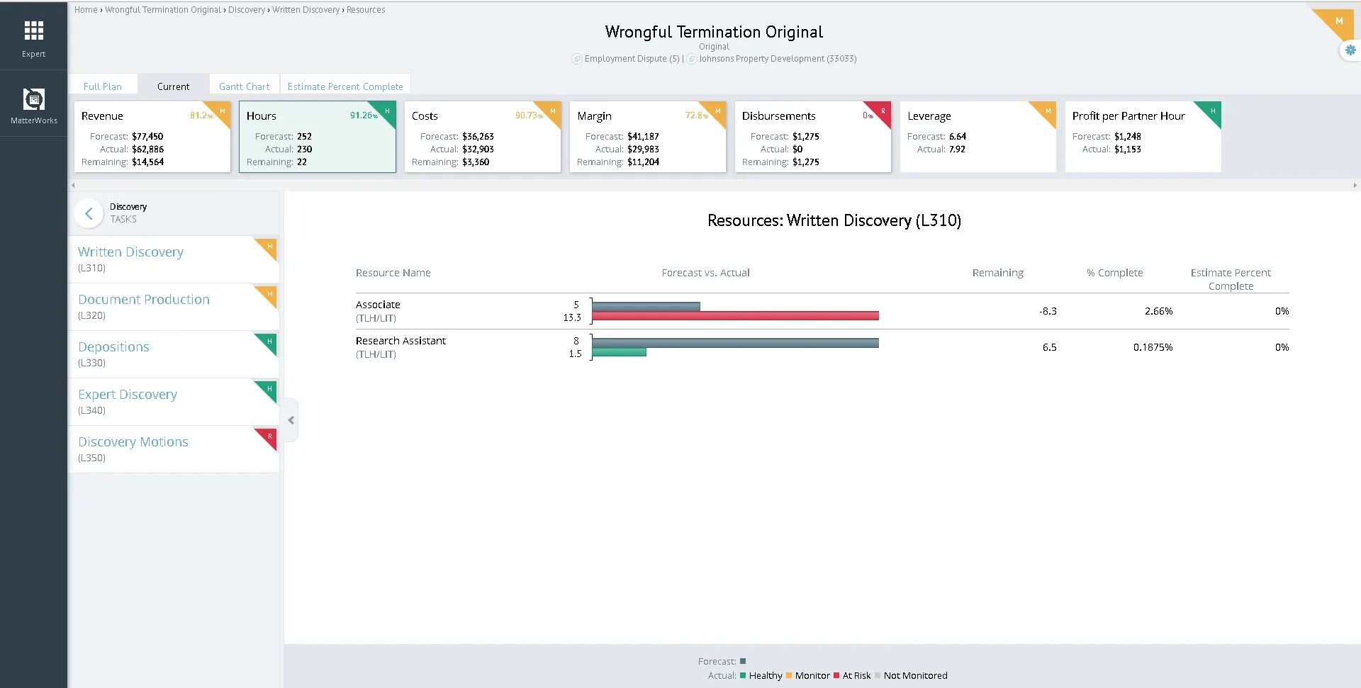 Estimate Percent Complete Monitor individual matters, groups, or portfolios with list or graphical views comparing forecasts versus actuals. Views by full plan, current position, GANNT, and percent complete at matter, phase, task, and resource levels provide instant access to matter performance. Matter managers and timekeepers can update the percentage completed for each phase, task, or resource allowing easy comparison of budget remaining to actual work effort.