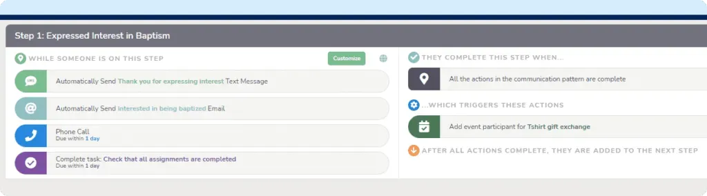 Re-engage members of your church or parish, guide people on their spiritual journey, foster donations, and more with tracks. Create steps in the journey for communications, meetings, and tasks and automate outreach or to-dos with conditions.