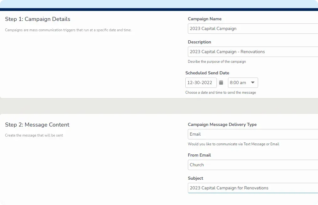 Create campaigns to share news, giving opportunities, volunteer openings, and more. Growth Method campaigns allow you to send emails or texts to all your members, or to specific segments.