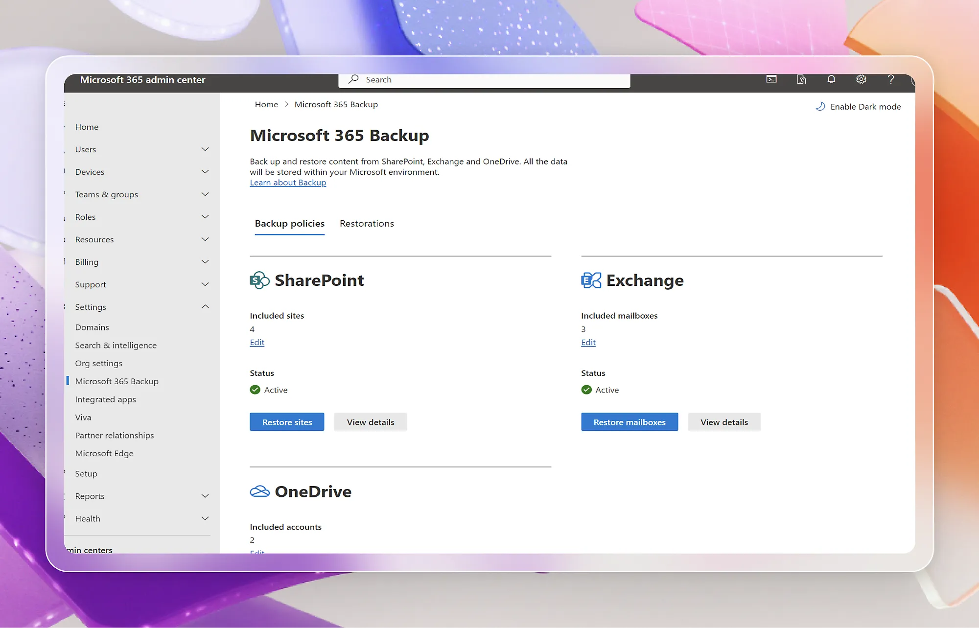 - **Manage on your own terms: **Manage data backup and restoration within the Microsoft 365 admin center or through an ISV solution.