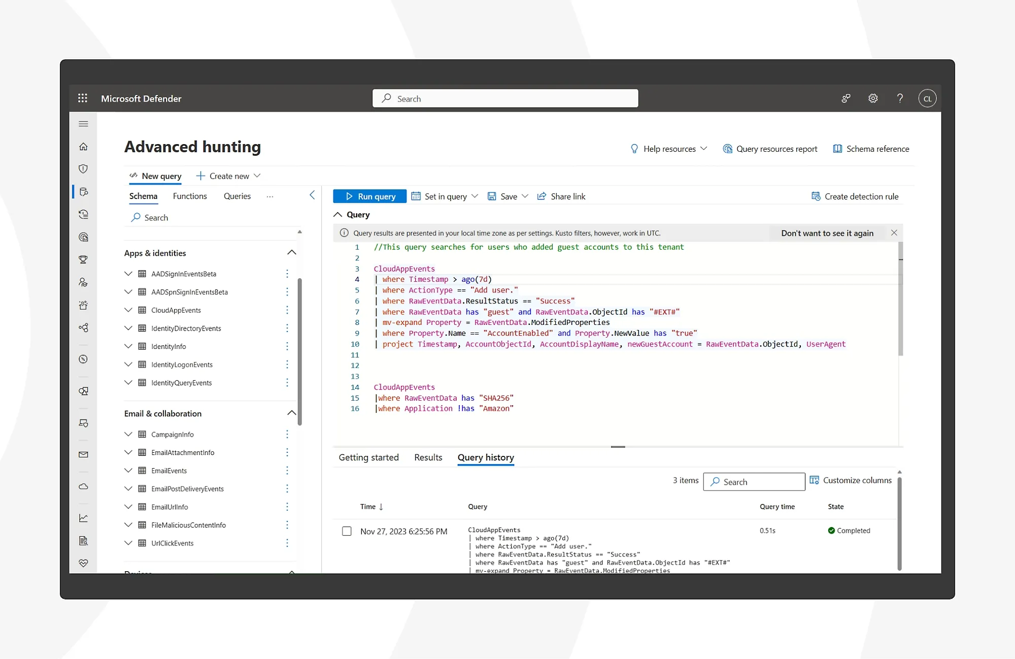 - **Protect against cyberthreats using advanced hunting in Microsoft Defender XDR: **Detect unusual behavior across apps to identify ransomware, compromised users, and suspicious activity. Analyze usage of apps and mitigate risks.