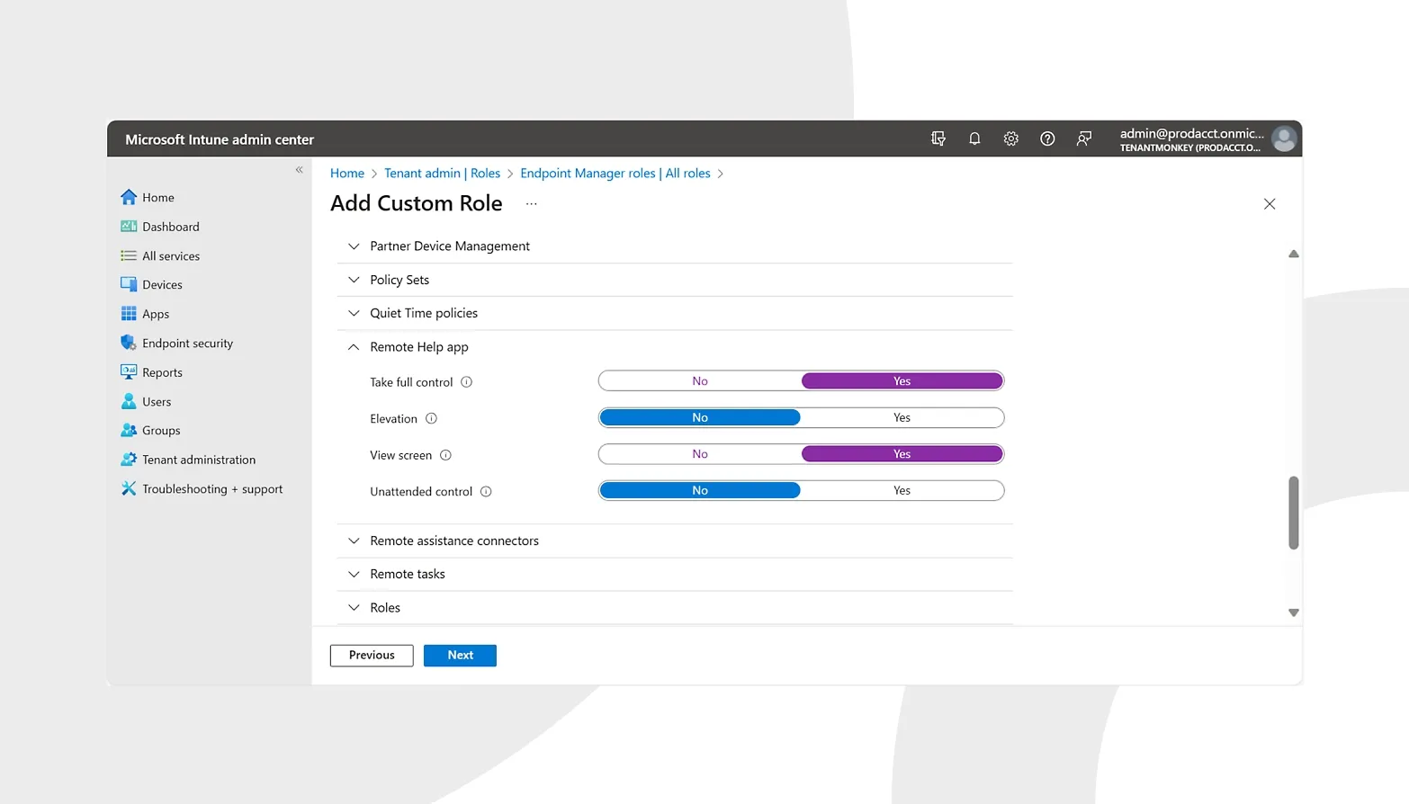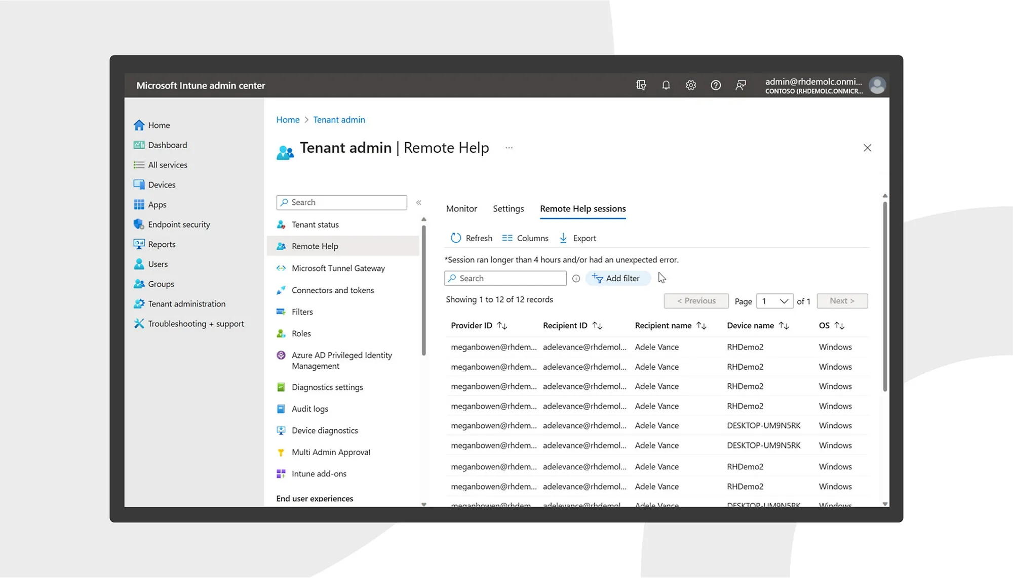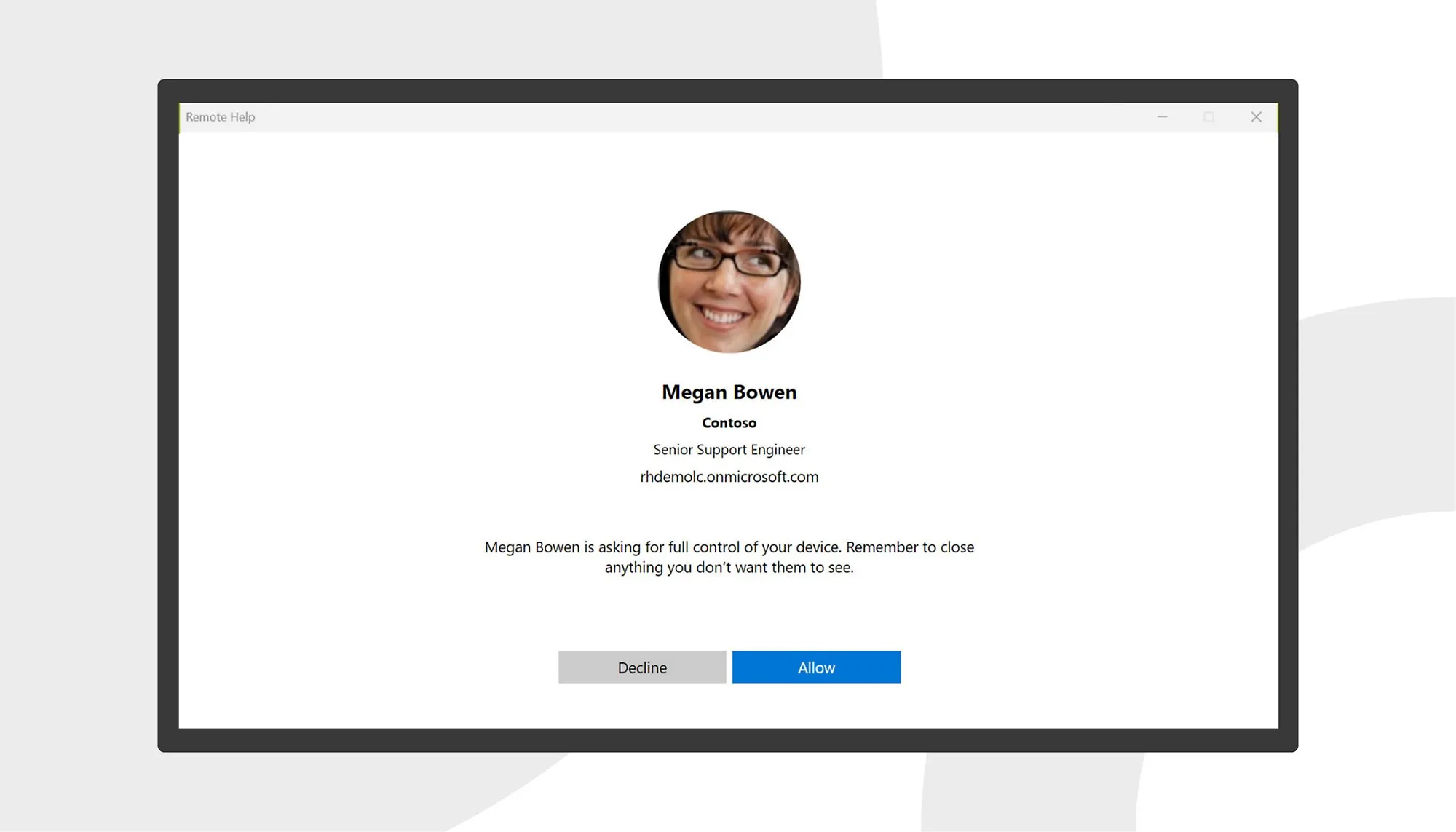 - **Role-based access control: **Manage who can help whom, and with which permissions, using the Intune admin console. Provide a trusted connection with verified company profile information.