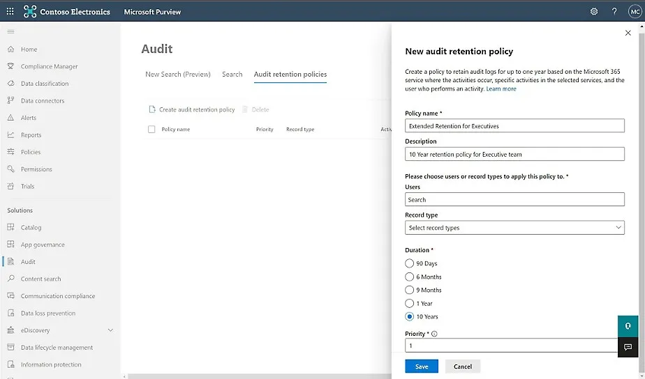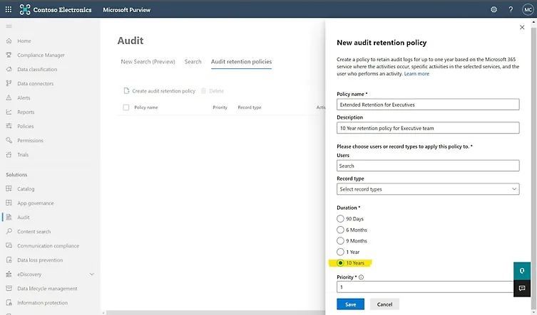 - **Longer retention of audit records: **Retain Audit (Premium) users' audit log records of Exchange, SharePoint, OneDrive, and Microsoft Entra ID for one year by default and 180 days for all other activities. Retain audit log records for up to 10 years with an add-on license.