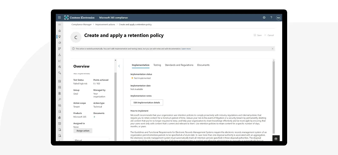 - **Continuous control assessment: **Receive continuous status and automatic credit results for technical controls as Compliance Manager scans through your environment and detects system settings.