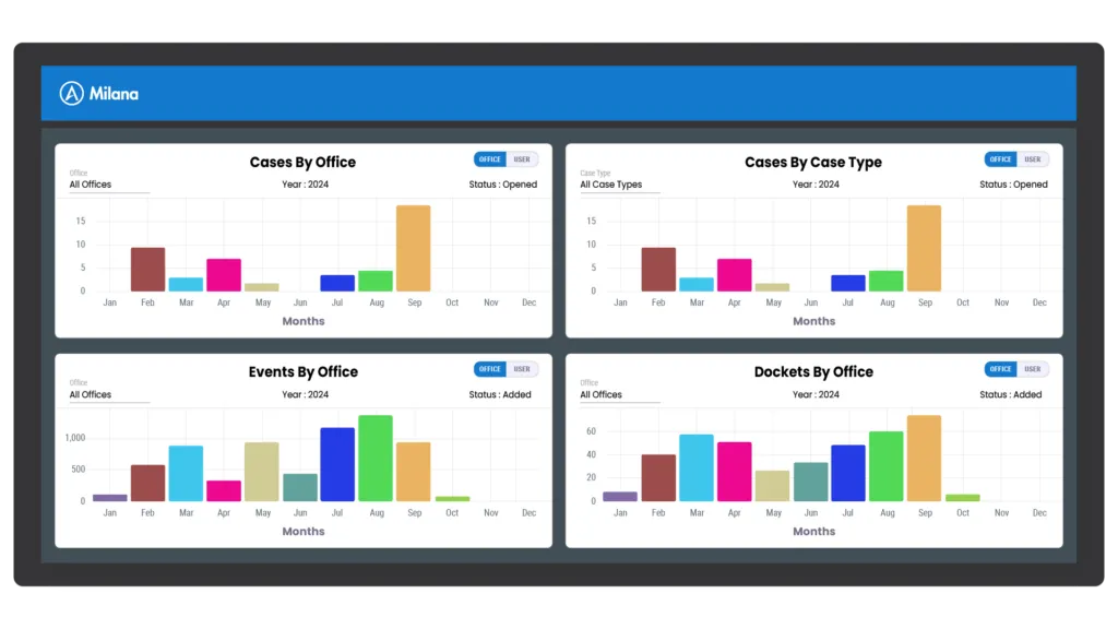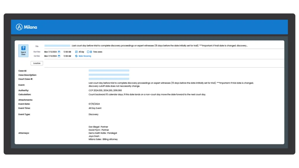 Milana delivers comprehensive, rules-based docketing and calendar management, minimizing risks and automating processes for law firms.