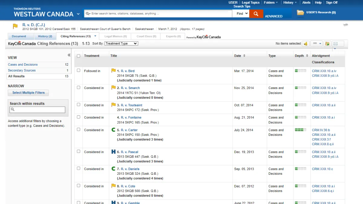 - **Ensure you are citing good law with KeyCite Canada: **Quickly verify whether a case, statute, or other legal authority is still good law. KeyCite Canada makes it possible for legal professionals to rely on the most accurate, current information when encountering invalid or overruled points of law.
