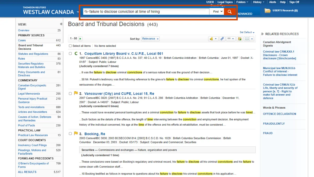 - **Find the information you need faster with Westlaw Canada Search: **Deliver the best results quickly and with more confidence with Canada’s most advanced legal search engine. You can use either natural language or Boolean connectors to find the exact content you need using this intuitive and easy-to-use search functionality.