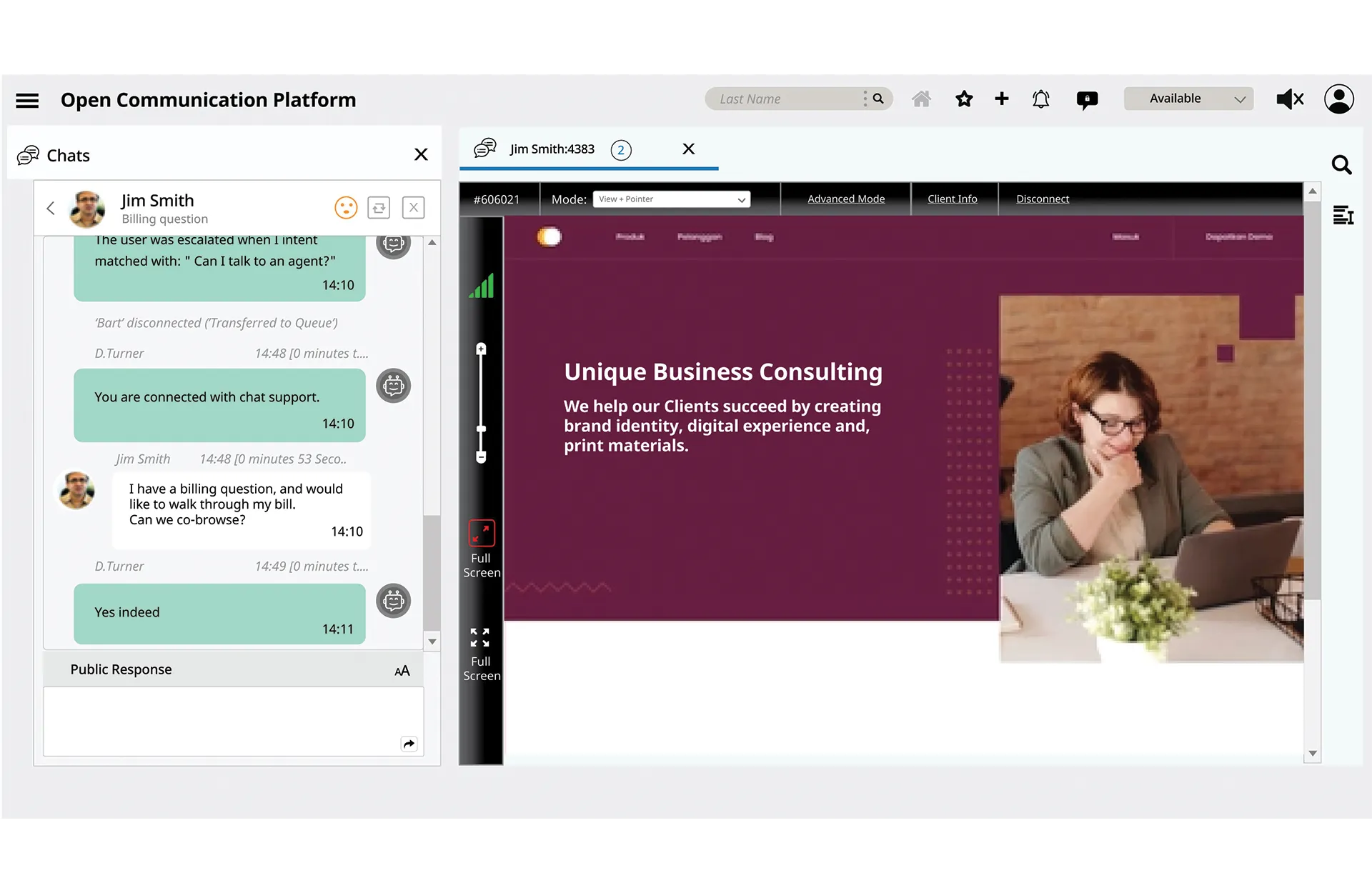 - Co-browsing Sessions: Increase first-time resolution by enabling agents to help customers through co-browsing sessions with defined rules and restrictions.